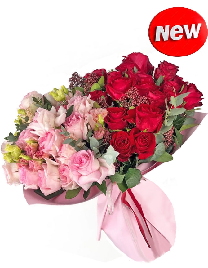 На фотографії представлений букет преміум-розміру, що ідеально підходить для особливого випадку. Він складається з 15 рожевих та 15 червоних троянд, еустоми та евкаліпта.