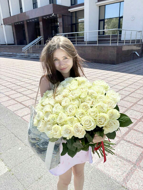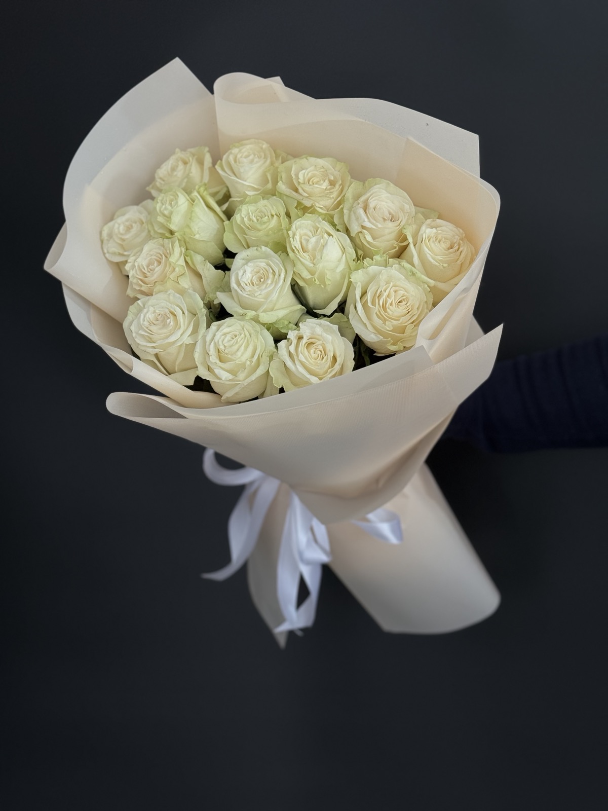 На цій сторінці можна замовити такий букет з білих троянд з довжиною стебла 80-90 см з Голландії або Еквадору.