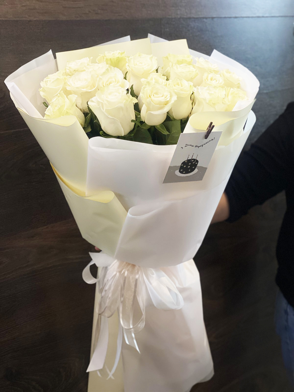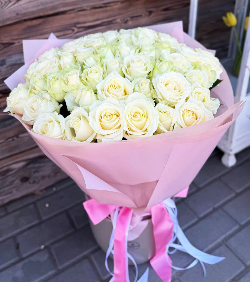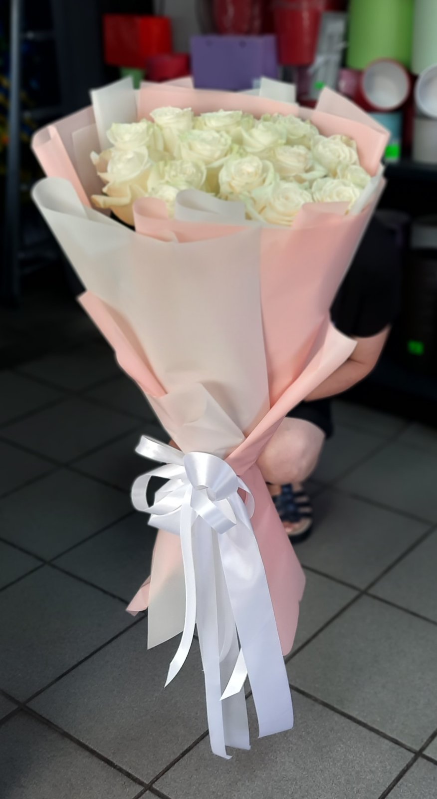 Білі троянди - символ вірності і чистоти. Букет білих троянд зі стеблом 80-90 см включає прекрасні троянди з великими бутонами, гілки декоративної зелені, ніжну гипсофилу (при наявності), а також сучасну дизайнерську упаковку, що підкреслює неперевершену красу букета як твори мистецтва флористики.