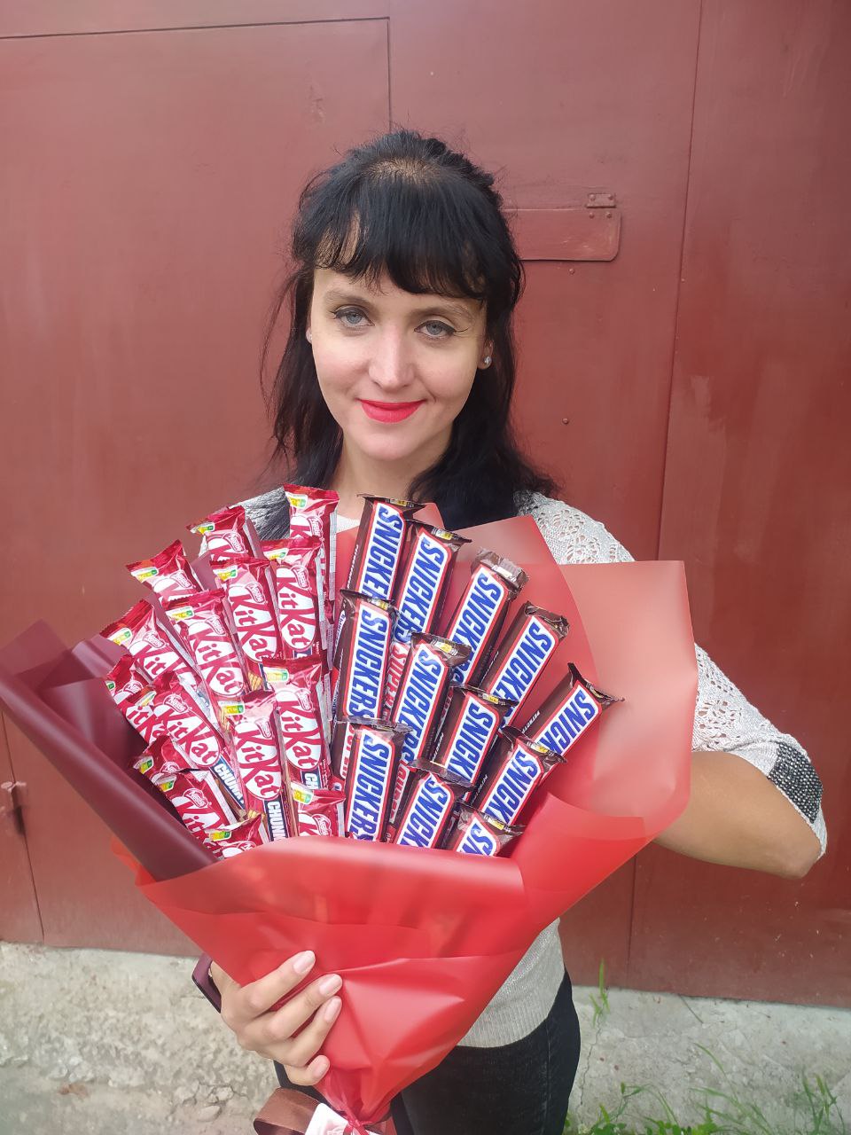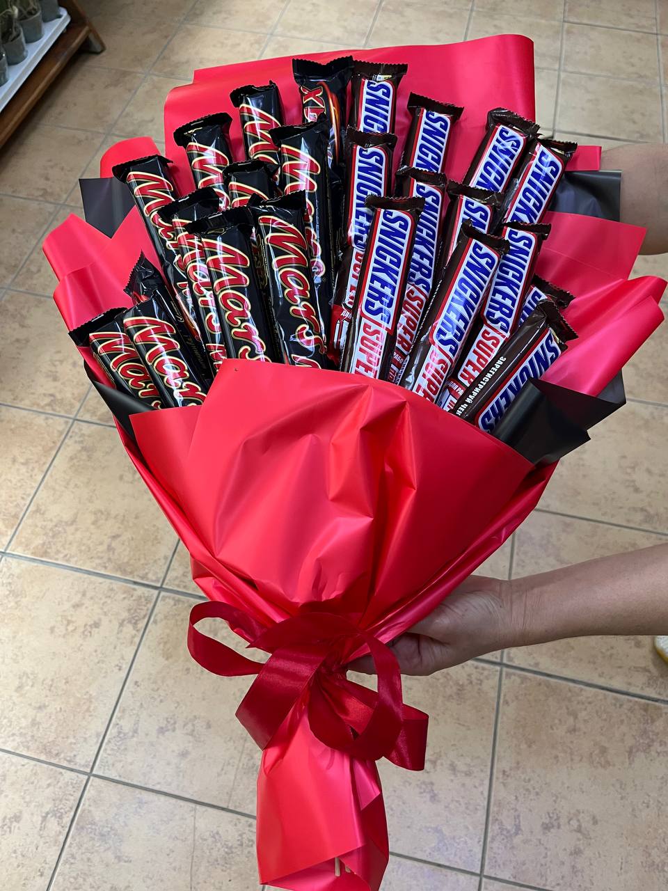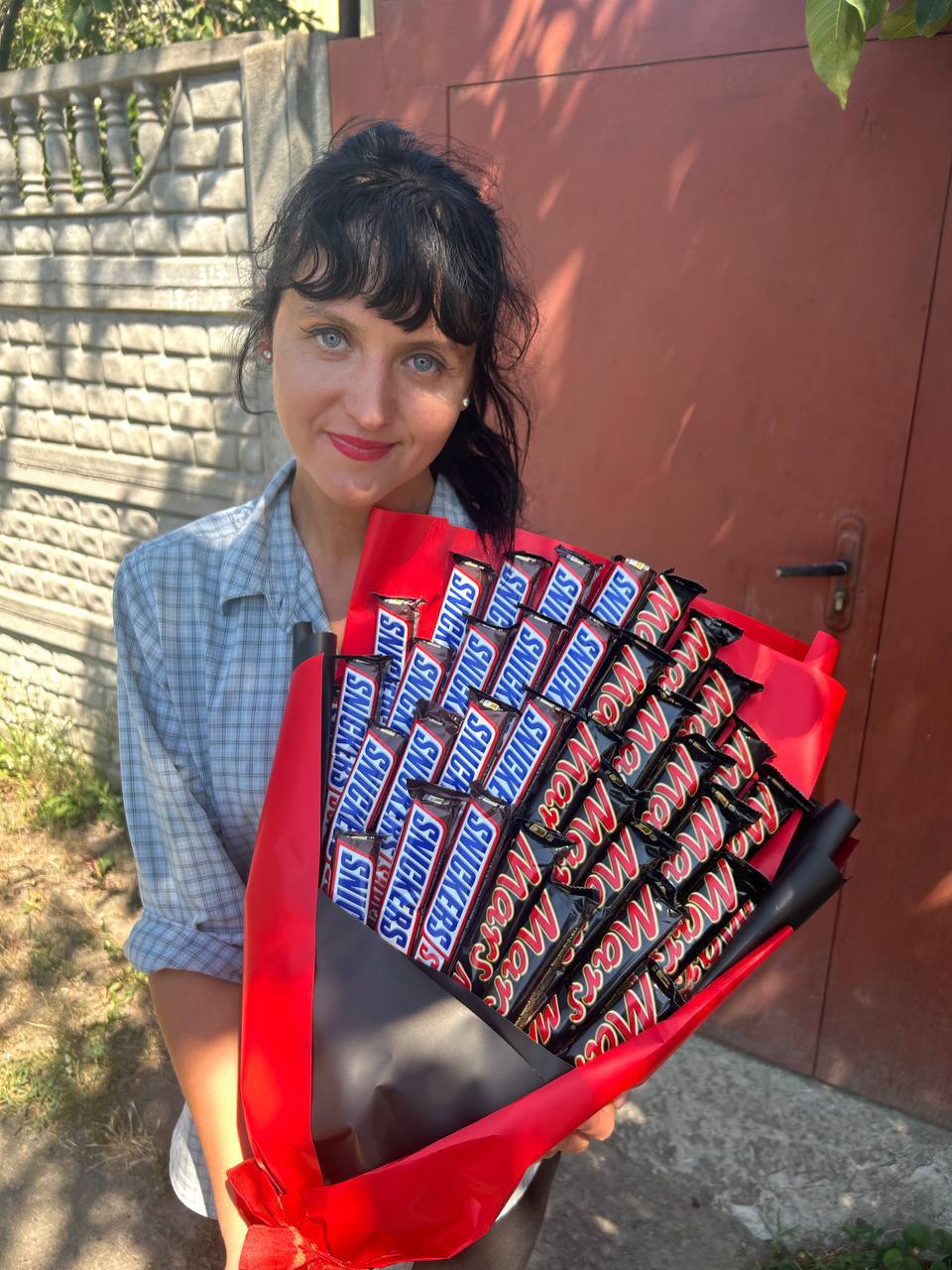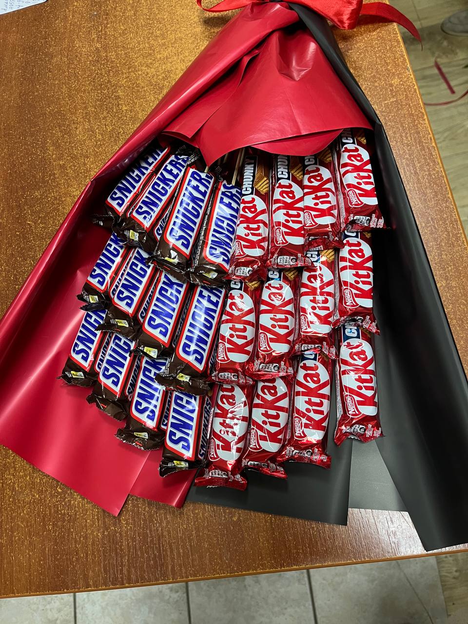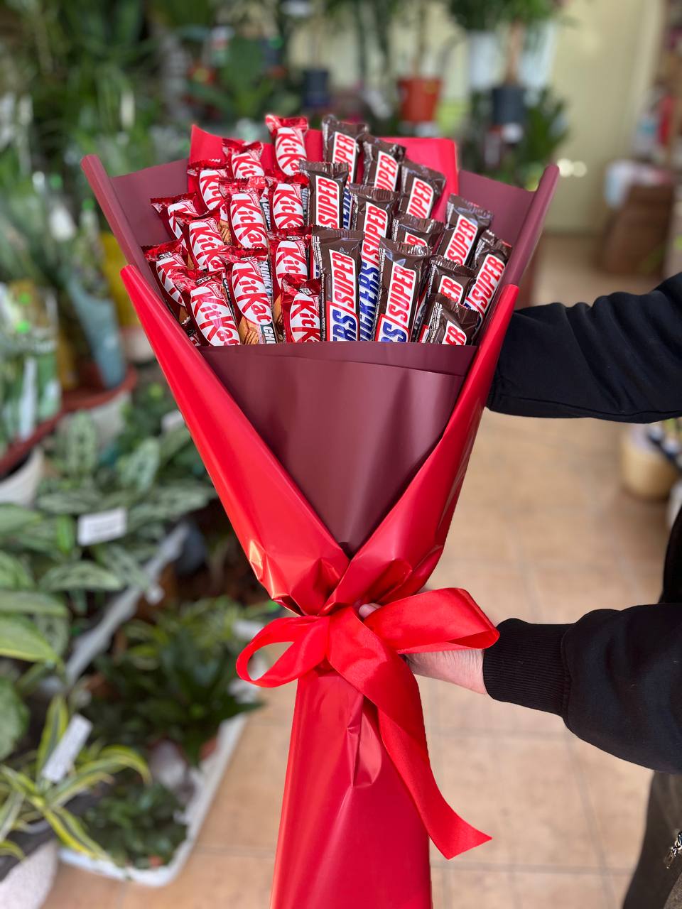 Стильно оформлений букет з смачненьких вафелек Kit-Kat і шоколадних батончиків Снікерс.
