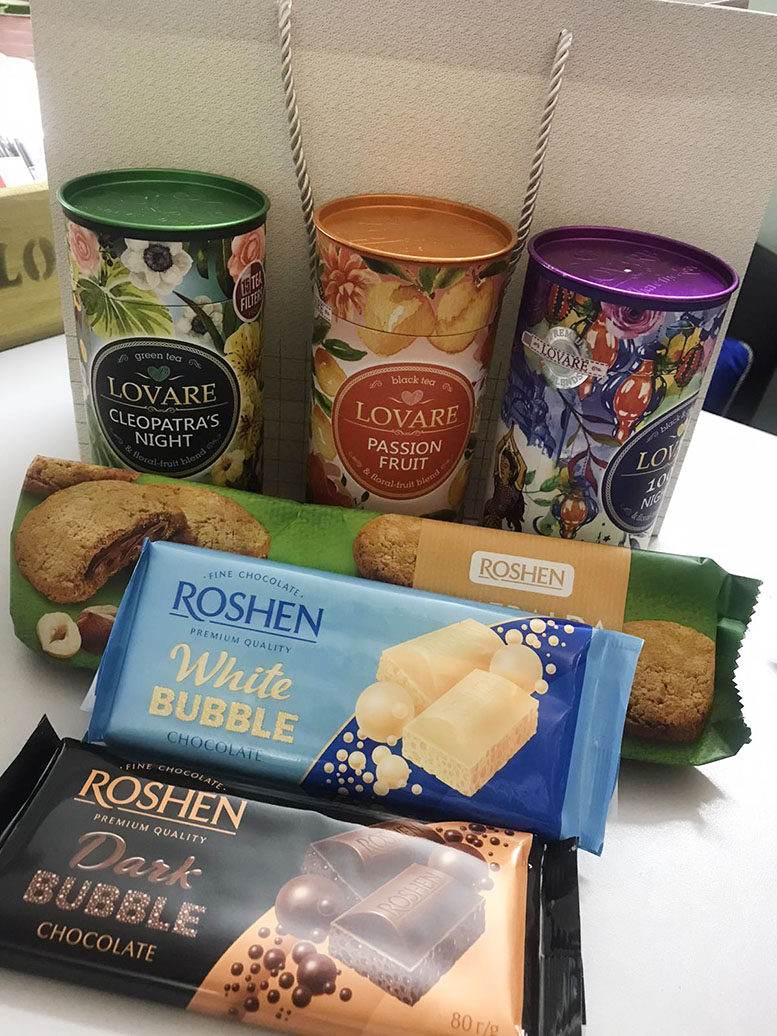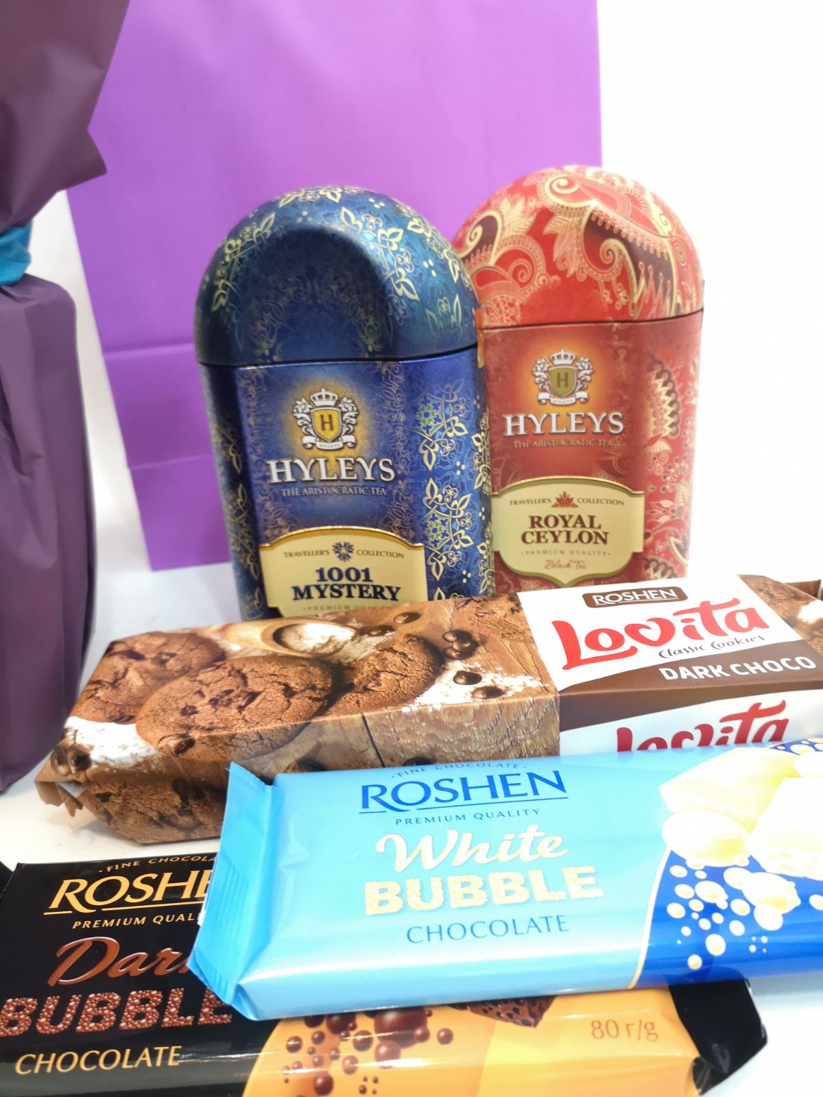Такий чай приємно поєднувати з шоколадом.Тому ми включили в набір чорний і білий шоколад, а також пачку печива з шоколадом.