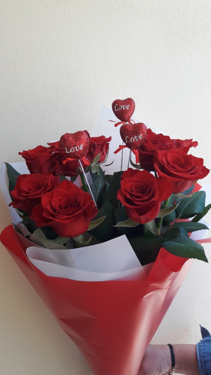 Traditional Red roses bouquet with the decorative hearts expresses the feelings absolutely clearly